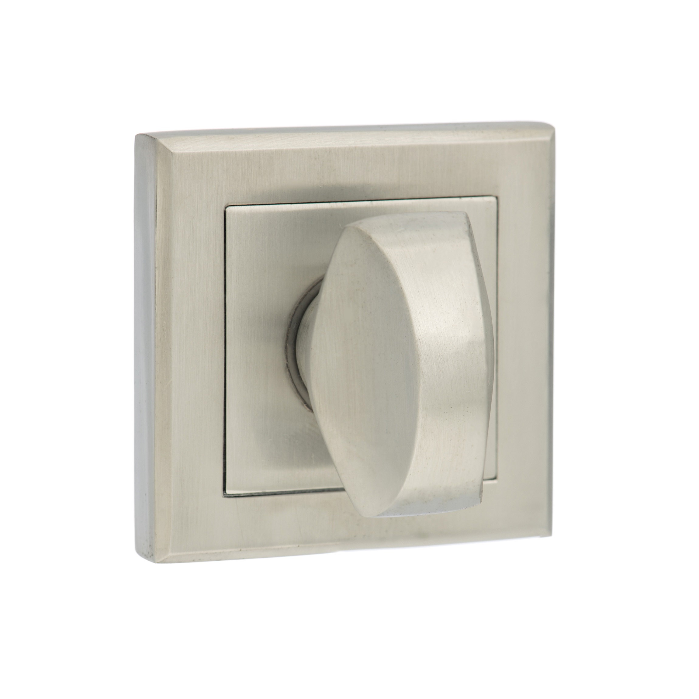 Designer modern style of square turn and release bathroom lock in option of satin or polished chrome finish; matches our range of designer modern square rose lever handles.