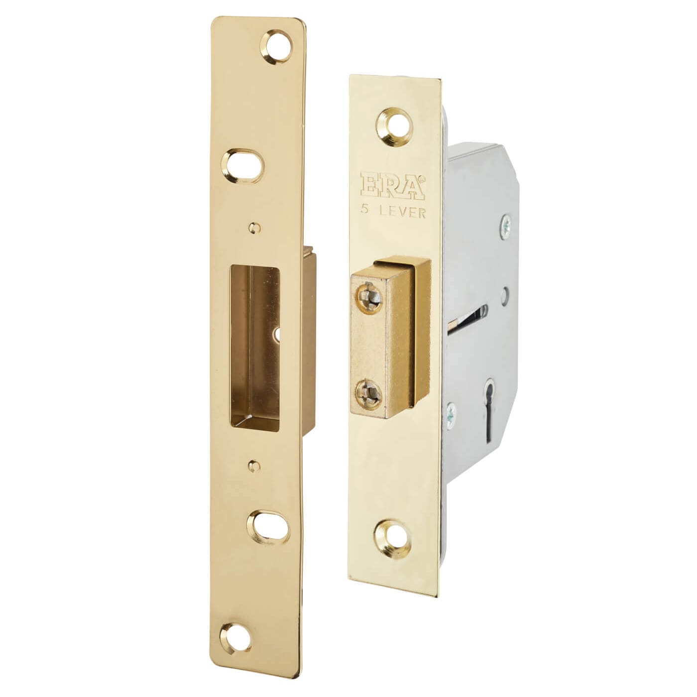 5 Lever Mortice Deadlock – 64mm or 76mm case sizes, brass deadbolt c/w hardened steel rollers. Deadbolt operated by key from both sides. Available in polished brass and satin chrome. Box striking plate supplied as standard. Supplied with two steel keys.