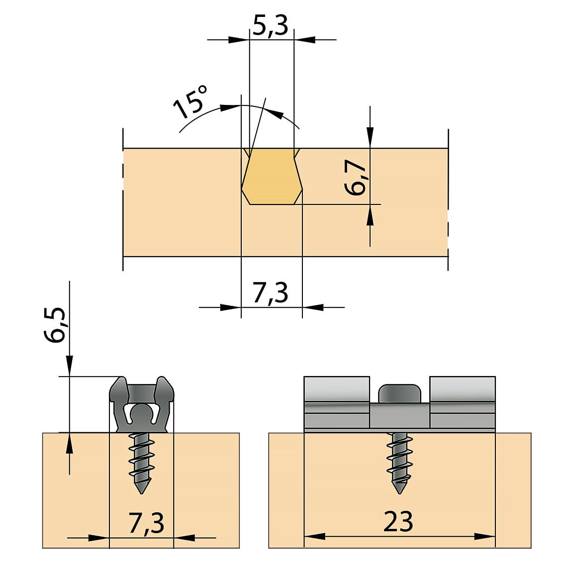 Installation of the Knapp sKlick: Using a plunge router or CNC and a dovetail router make a pocket groove or continuous groove. Can also be used without groove if in conjunction with the Klick Pro