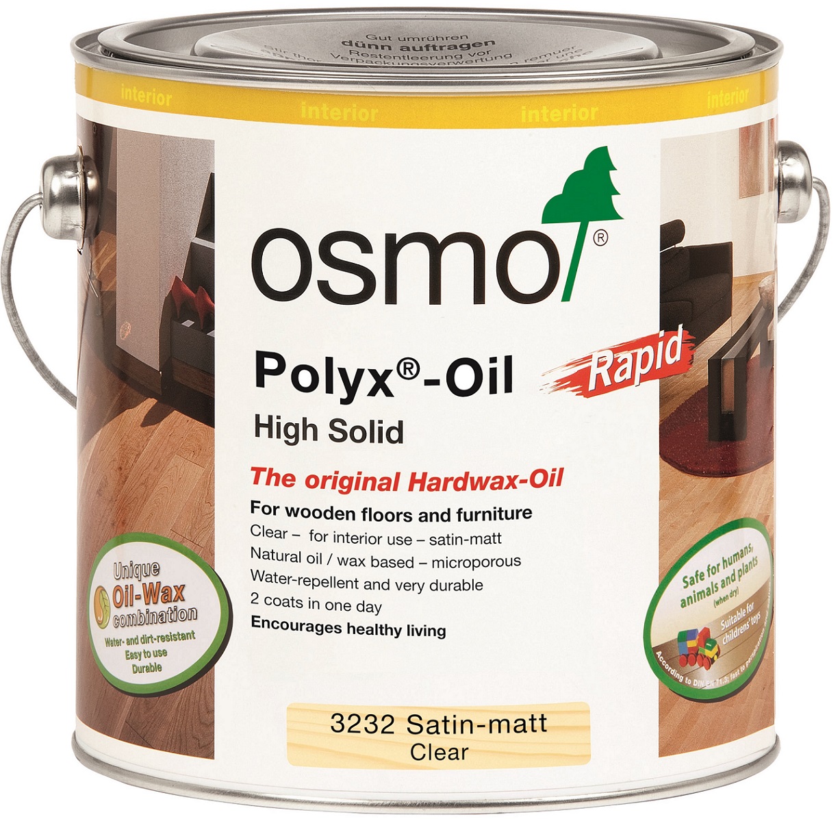 Osmo 3232 Polyx Oil Rapid is a clear satin matt oil that has been developed from natural oils and waxes to proved the most hard wearing and durable protection for wooden flooring and furniture. The Osmo 3232 is a fast drying, clear wood finish with special surface hardness that uniquely combines the advantages of natural oils and waxes in one product.