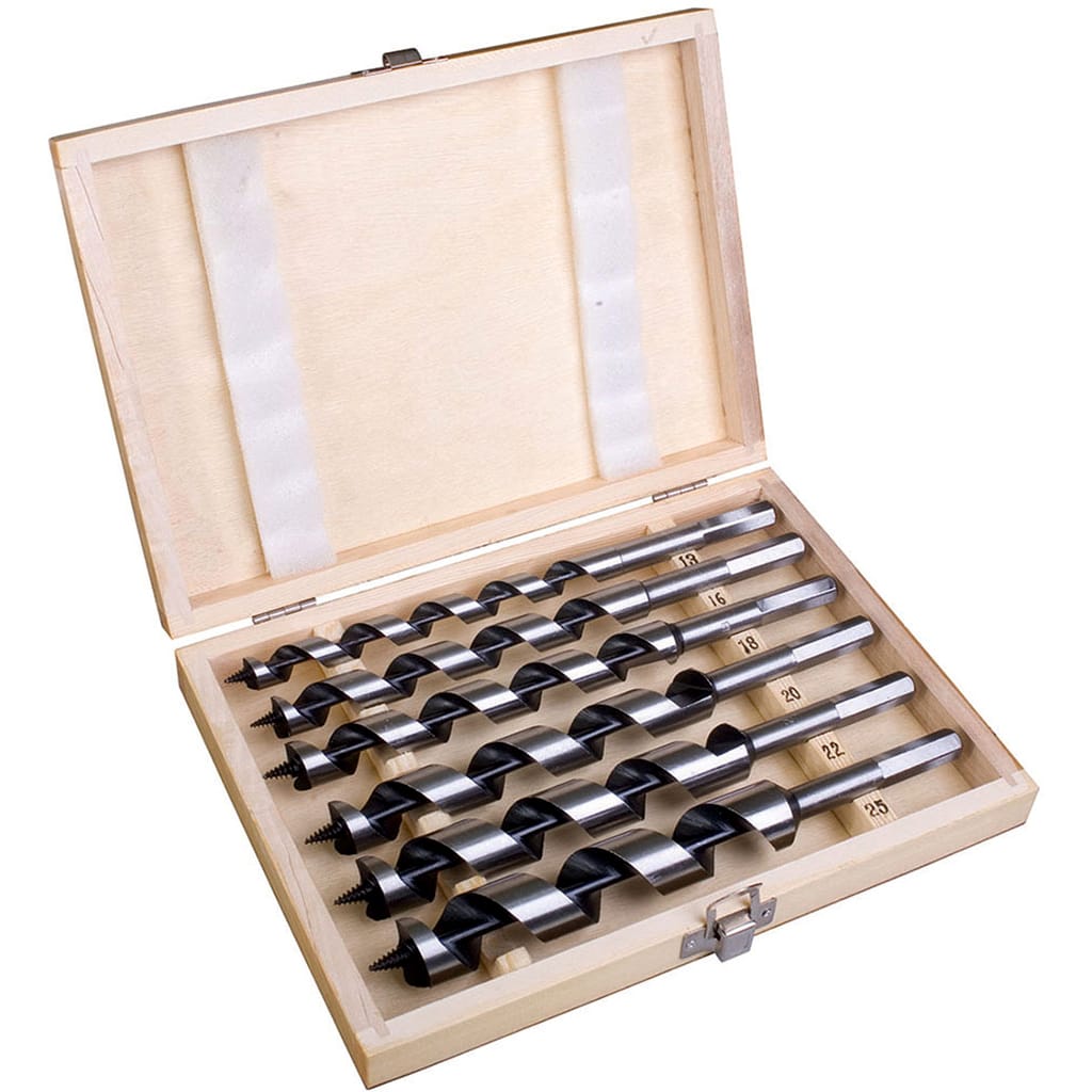 6 Pc 230mm Wood auger bit set – Suitable for drilling soft and hard woods – dry or wet. Threaded tip for self centring and self feeding. One main spur and one pre-cutting spur for accuracy, Smooth flute ensures chip removal without jamming. Flute geometry enables fast drilling – 13,16,18, 20, 22, 25