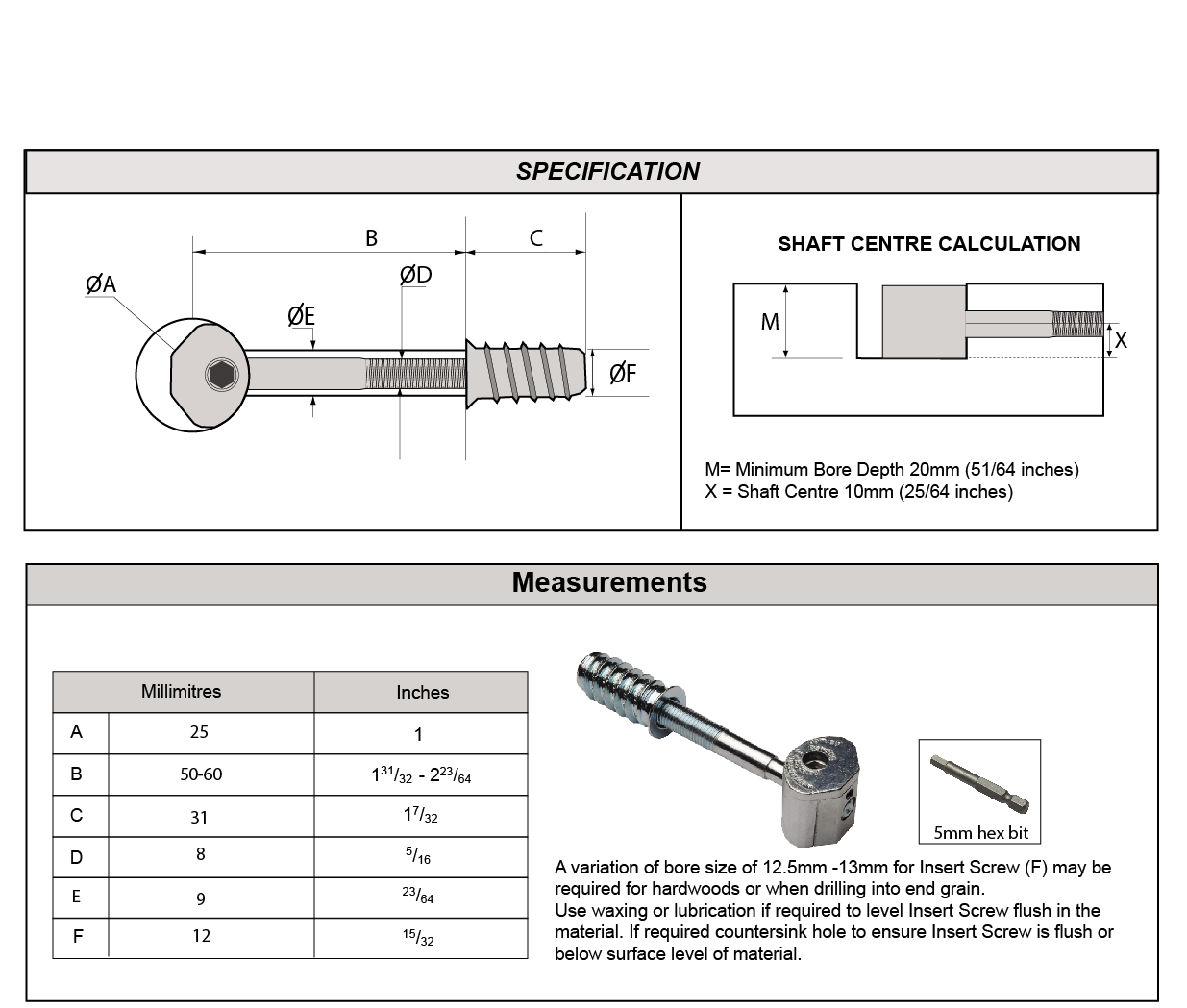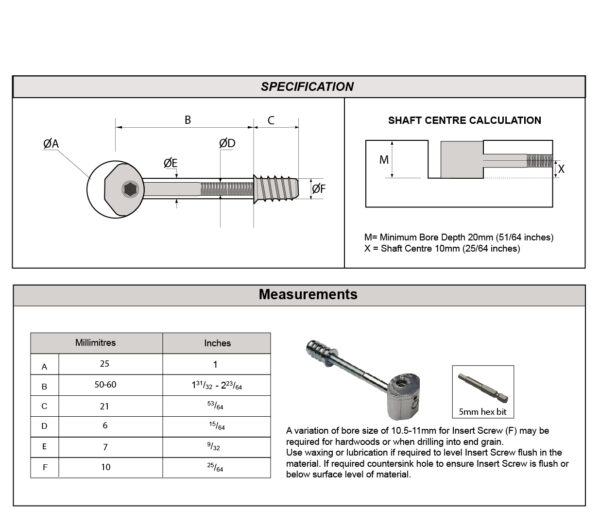 25mm Bore St Zipbolt – Zipbolt connectors have a unique integrated gearing system driven by a hex drive which offers easier, stronger and faster unrivalled tensioning power. Allows the user to tension the bolt in a matter of seconds using either a hand held key, ratchet driver or a power drill, eliminating the difficult handling and time consuming problems associated with using a spanner. Now the preferred choice for those who appreciate the faster production time and cost saving that Zipbolt provides. Ideally suited for worktops, staircase assembly, furniture construction, joinery, flat pack furniture.